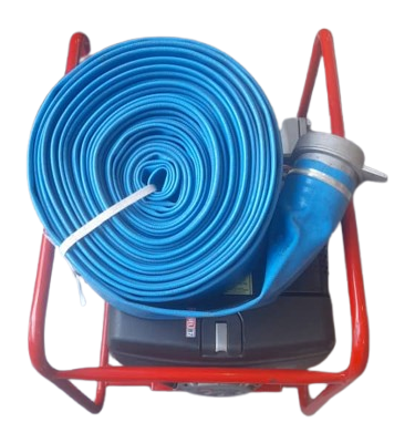 Includes 4” dia suction hose & 7 meter length including hose connectors & strainer, plus 24 meter length outlet hose with connector mounted on heavy duty metal frame for easy transport.